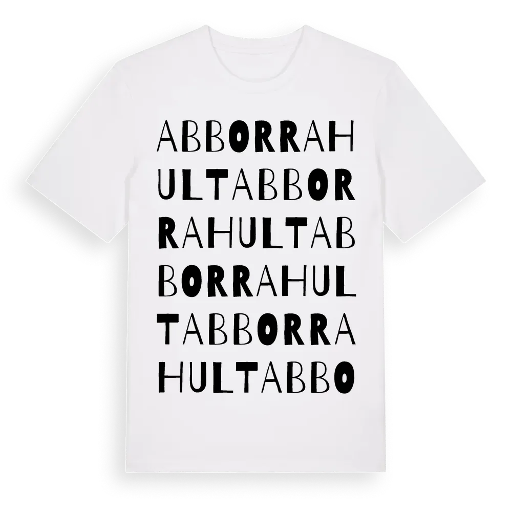 Abborrahult ordlek t-shirt är inspirerad av Abborrahult i Blekinge län, Sverige. Tröjan är designad för dig som har en speciell koppling till platsen – oavsett om du bor här, har rötterna här eller bara älskar Abborrahult.