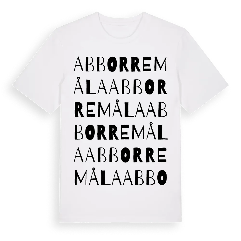 Abborremåla ordlek t-shirt är inspirerad av byn Abborremåla i Blekinge län, Sverige. Tröjan är designad för dig som har en speciell koppling till platsen – oavsett om du bor här, har rötterna här eller bara älskar Abborremåla.