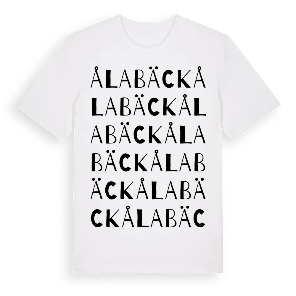 Ålabäck ordlek t-shirt är inspirerad av Ålabäck i Blekinge län, Sverige. Tröjan är designad för dig som har en speciell koppling till platsen – oavsett om du bor här, har rötterna här eller bara älskar Ålabäck.