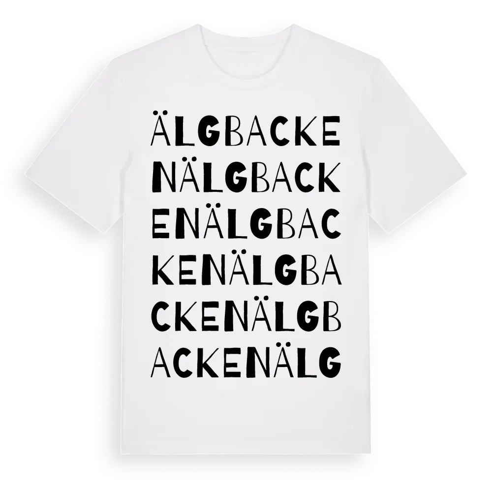 Älgbacken ordlek t-shirt är inspirerad av byn Älgbacken i Blekinge län, Sverige. Tröjan är designad för dig som har en speciell koppling till platsen – oavsett om du bor här, har rötterna här eller bara älskar Älgbacken.