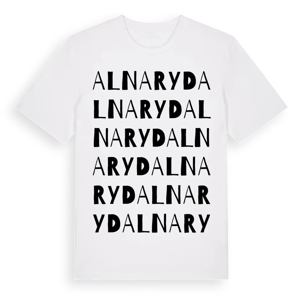 Alnaryd ordlek t-shirt är inspirerad av byn Alnaryd i Blekinge län, Sverige. Tröjan är designad för dig som har en speciell koppling till platsen – oavsett om du bor här, har rötterna här eller bara älskar Alnaryd.
