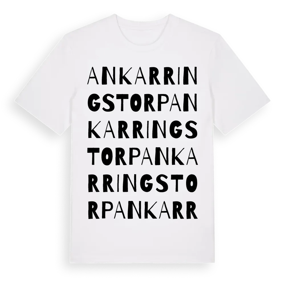 Ankarringstorp ordlek t-shirt är inspirerad av Ankarringstorp i Blekinge län, Sverige. Tröjan är designad för dig som har en speciell koppling till platsen – oavsett om du bor här, har rötterna här eller bara älskar Ankarringstorp.
