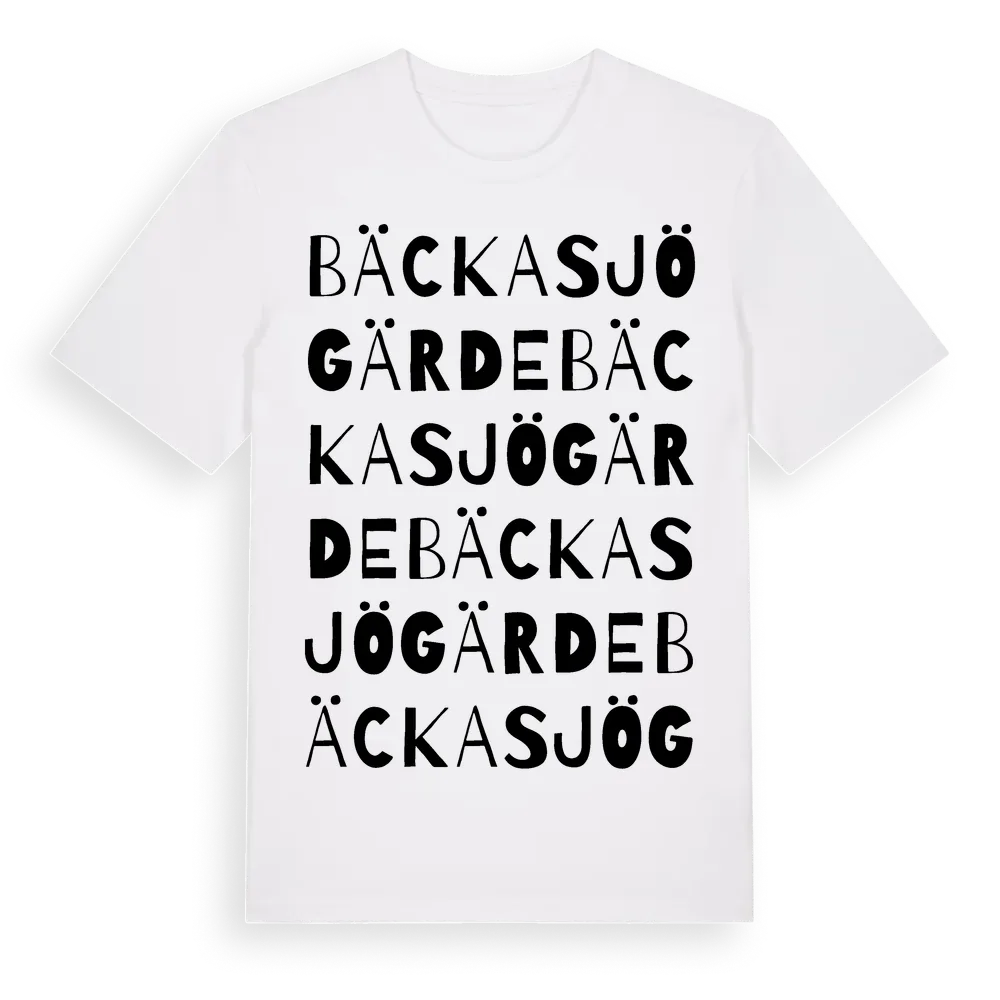 Bäckasjögärde ordlek t-shirt är inspirerad av byn Bäckasjögärde i Blekinge län, Sverige. Tröjan är designad för dig som har en speciell koppling till platsen – oavsett om du bor här, har rötterna här eller bara älskar Bäckasjögärde.