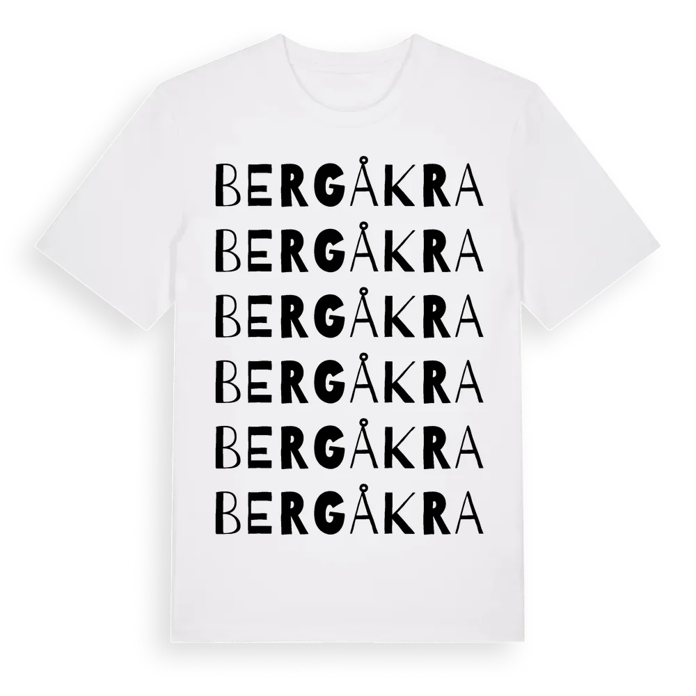 Bergåkra ordlek t-shirt är inspirerad av Bergåkra i Blekinge län, Sverige. Tröjan är designad för dig som har en speciell koppling till platsen – oavsett om du bor här, har rötterna här eller bara älskar Bergåkra.