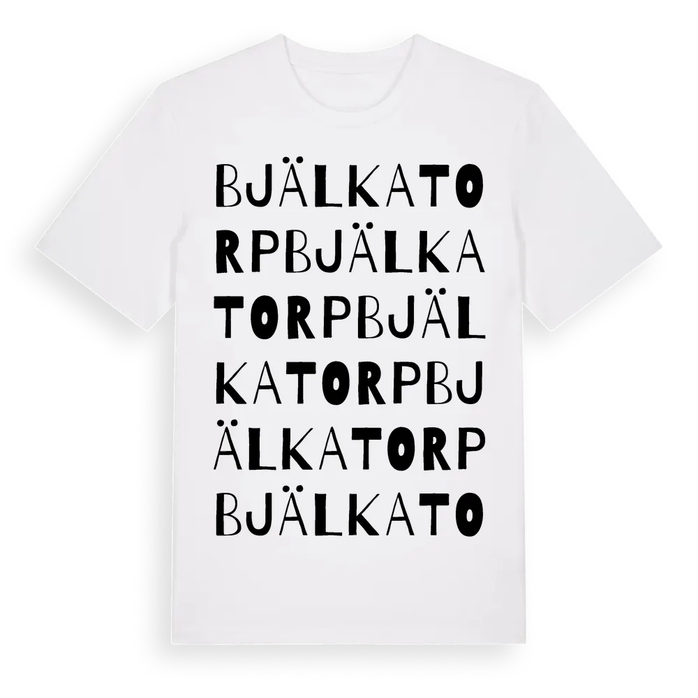 Bjälkatorp ordlek t-shirt är inspirerad av Bjälkatorp i Blekinge län, Sverige. Tröjan är designad för dig som har en speciell koppling till platsen – oavsett om du bor här, har rötterna här eller bara älskar Bjälkatorp.