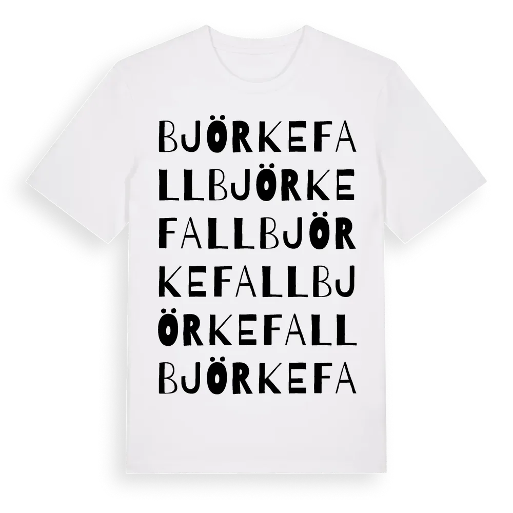 Björkefall ordlek t-shirt är inspirerad av byn Björkefall i Blekinge län, Sverige. Tröjan är designad för dig som har en speciell koppling till platsen – oavsett om du bor här, har rötterna här eller bara älskar Björkefall.