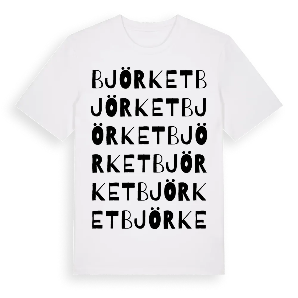 Björket ordlek t-shirt är inspirerad av Björket i Blekinge län, Sverige. Tröjan är designad för dig som har en speciell koppling till platsen – oavsett om du bor här, har rötterna här eller bara älskar Björket.
