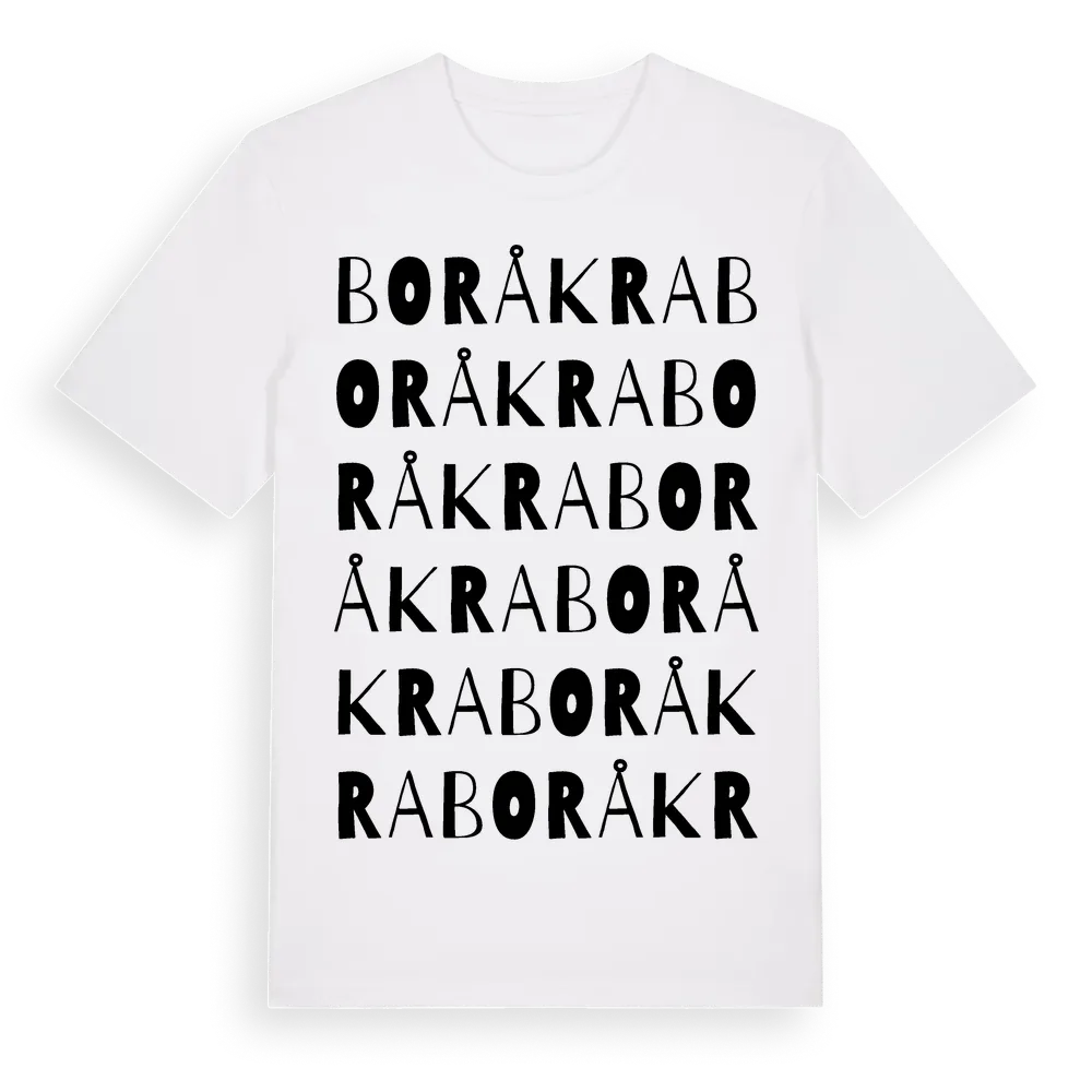 Boråkra ordlek t-shirt är inspirerad av Boråkra i Blekinge län, Sverige. Tröjan är designad för dig som har en speciell koppling till platsen – oavsett om du bor här, har rötterna här eller bara älskar Boråkra.
