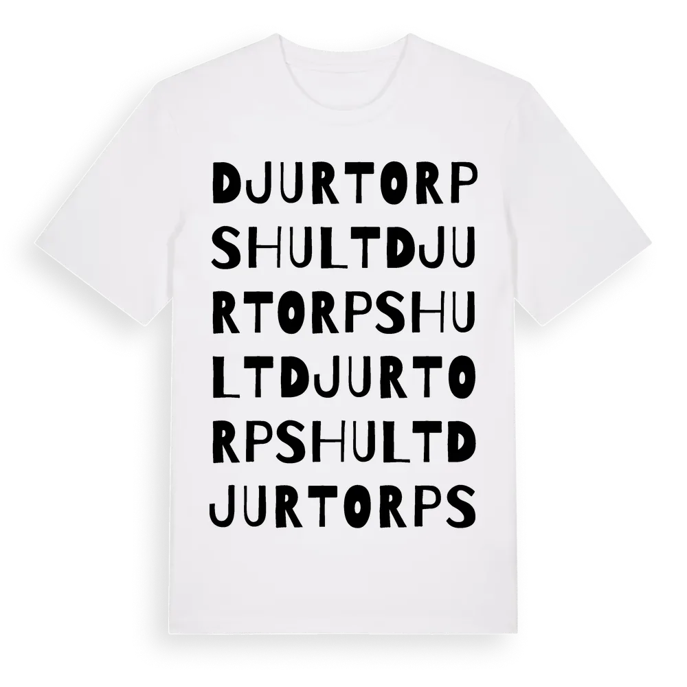 Djurtorpshult ordlek t-shirt är inspirerad av Djurtorpshult i Blekinge län, Sverige. Tröjan är designad för dig som har en speciell koppling till platsen – oavsett om du bor här, har rötterna här eller bara älskar Djurtorpshult.