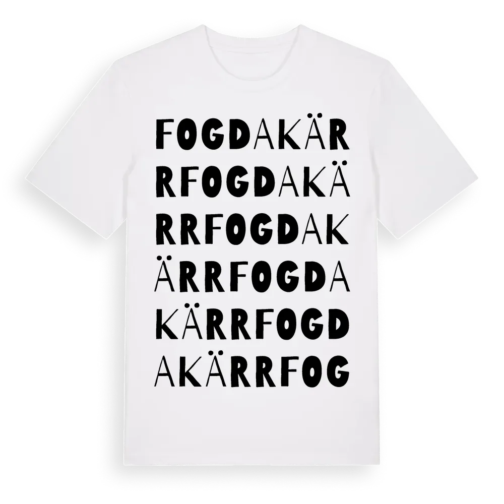Fogdakärr ordlek t-shirt är inspirerad av byn Fogdakärr i Blekinge län, Sverige. Tröjan är designad för dig som har en speciell koppling till platsen – oavsett om du bor här, har rötterna här eller bara älskar Fogdakärr.