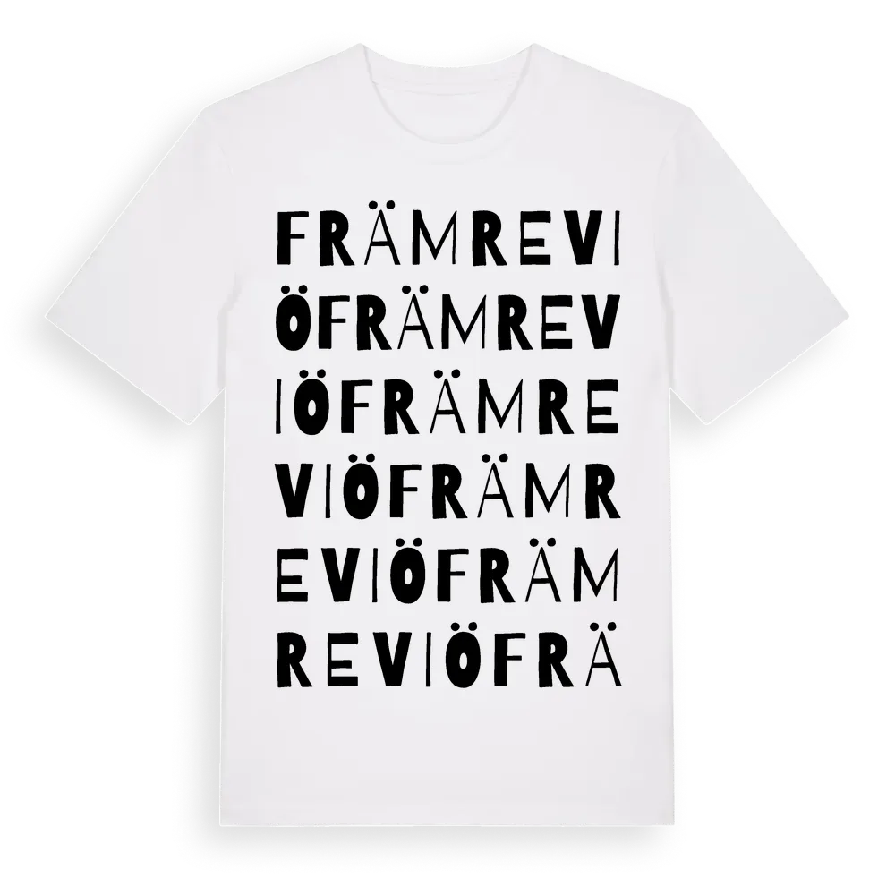 Främre Viö ordlek t-shirt är inspirerad av byn Främre Viö i Blekinge län, Sverige. Tröjan är designad för dig som har en speciell koppling till platsen – oavsett om du bor här, har rötterna här eller bara älskar Främre Viö.