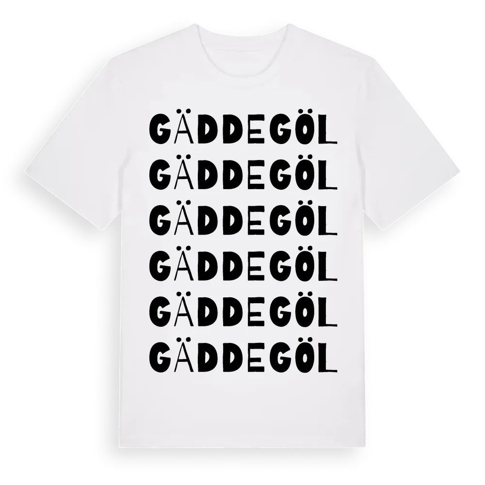 Gäddegöl ordlek t-shirt är inspirerad av byn Gäddegöl i Blekinge län, Sverige. Tröjan är designad för dig som har en speciell koppling till platsen – oavsett om du bor här, har rötterna här eller bara älskar Gäddegöl.