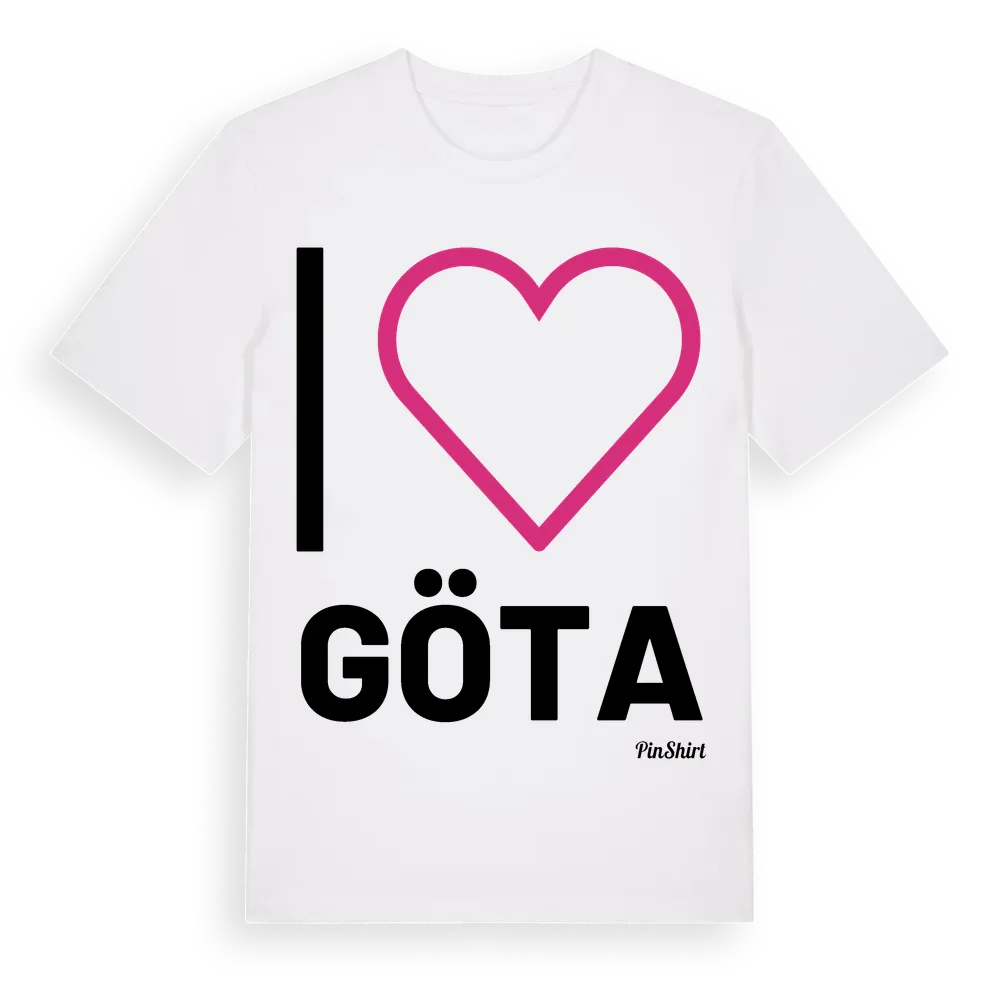 Det klassiska "I ❤ Göta"-motivet i stort format som täcker hela bröstet. För dig som vill visa kärleken till Göta på riktigt. Premium bomull, unisex – från Göta i Blekinge län.