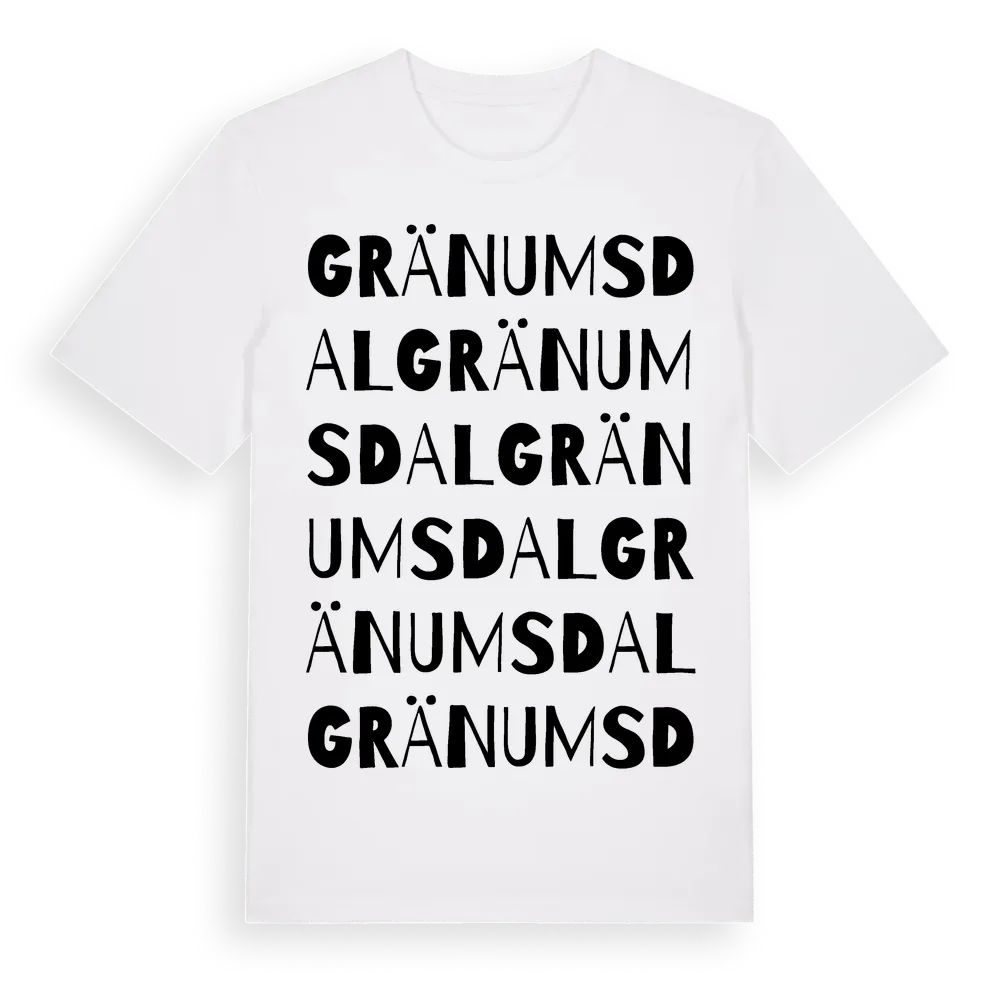 Gränumsdal ordlek t-shirt är inspirerad av byn Gränumsdal i Blekinge län, Sverige. Tröjan är designad för dig som har en speciell koppling till platsen – oavsett om du bor här, har rötterna här eller bara älskar Gränumsdal.