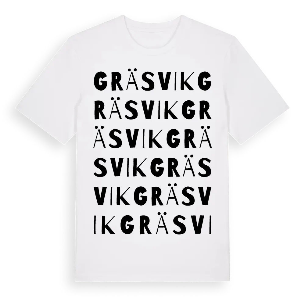 Gräsvik ordlek t-shirt är inspirerad av stadsdelen Gräsvik i Blekinge län, Sverige. Tröjan är designad för dig som har en speciell koppling till platsen – oavsett om du bor här, har rötterna här eller bara älskar Gräsvik.