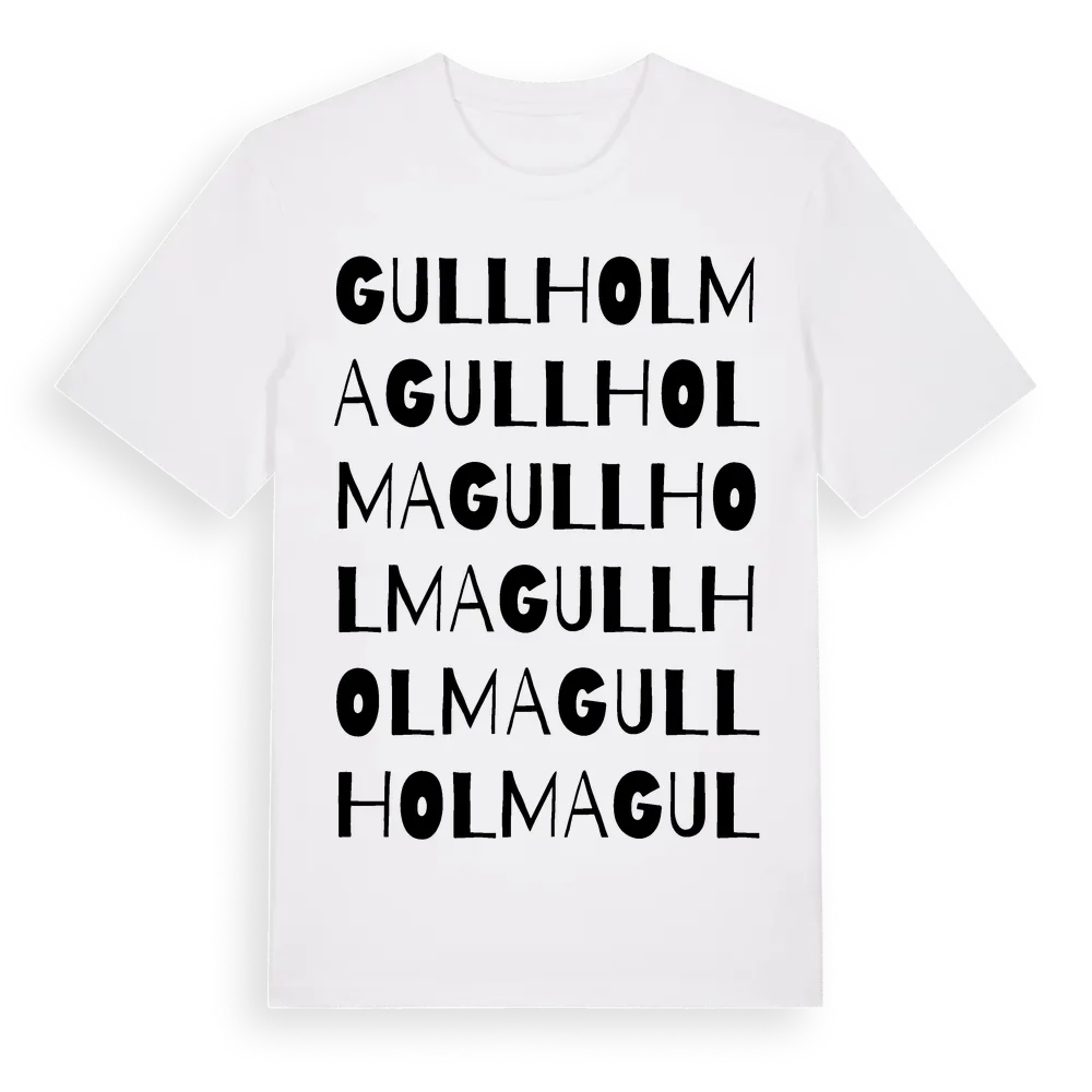 Gullholma ordlek t-shirt är inspirerad av byn Gullholma i Blekinge län, Sverige. Tröjan är designad för dig som har en speciell koppling till platsen – oavsett om du bor här, har rötterna här eller bara älskar Gullholma.