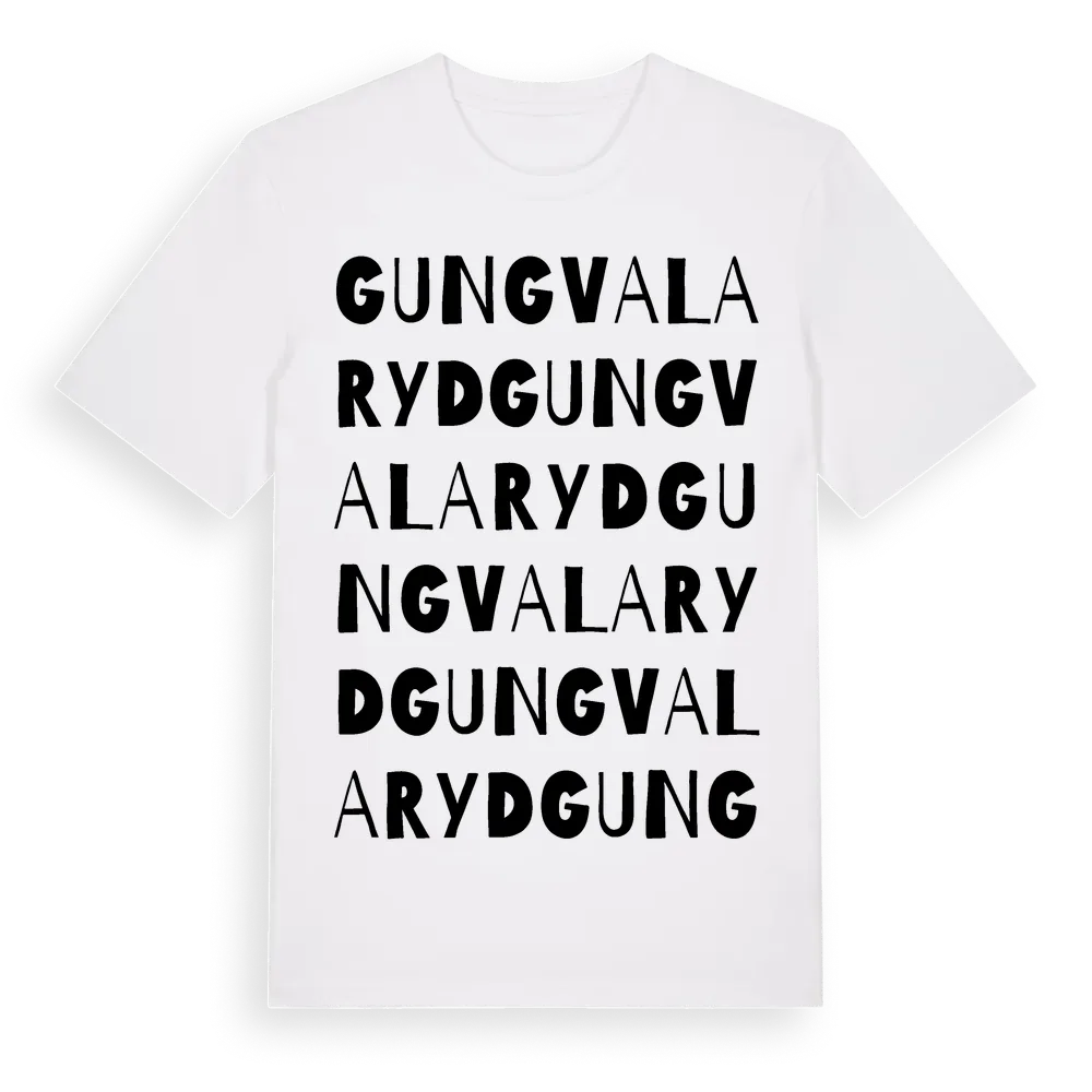 Gungvalaryd ordlek t-shirt är inspirerad av byn Gungvalaryd i Blekinge län, Sverige. Tröjan är designad för dig som har en speciell koppling till platsen – oavsett om du bor här, har rötterna här eller bara älskar Gungvalaryd.