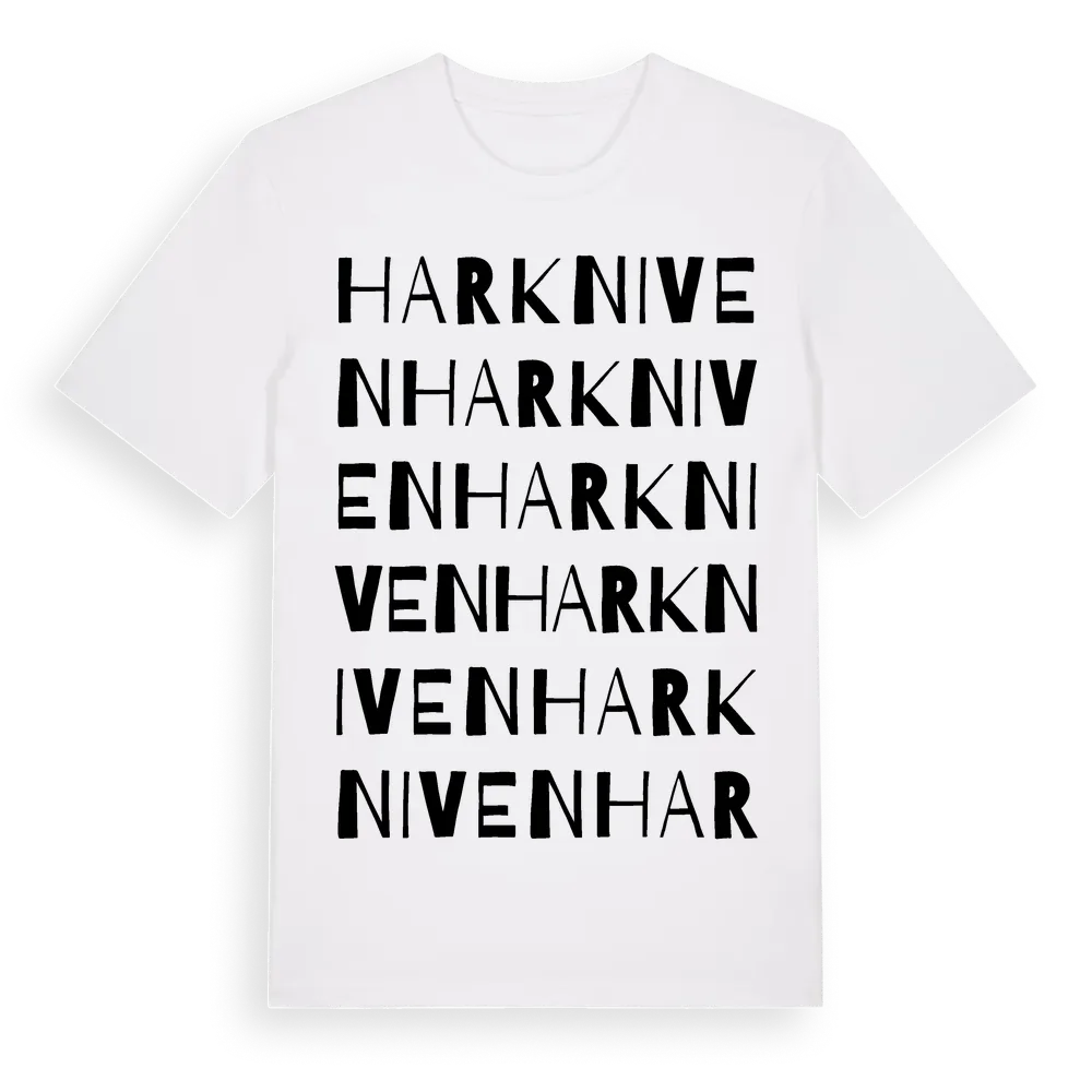 Harkniven ordlek t-shirt är inspirerad av byn Harkniven i Blekinge län, Sverige. Tröjan är designad för dig som har en speciell koppling till platsen – oavsett om du bor här, har rötterna här eller bara älskar Harkniven.