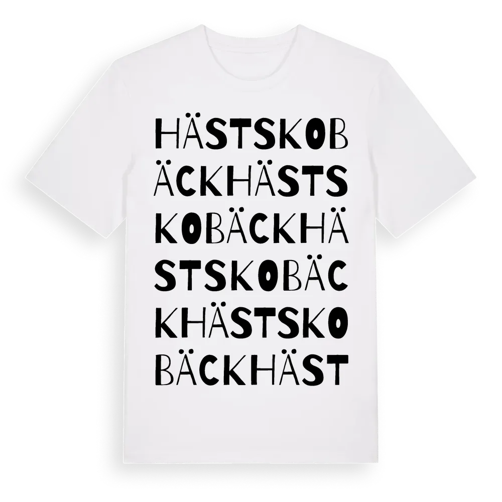 Hästskobäck ordlek t-shirt är inspirerad av Hästskobäck i Blekinge län, Sverige. Tröjan är designad för dig som har en speciell koppling till platsen – oavsett om du bor här, har rötterna här eller bara älskar Hästskobäck.