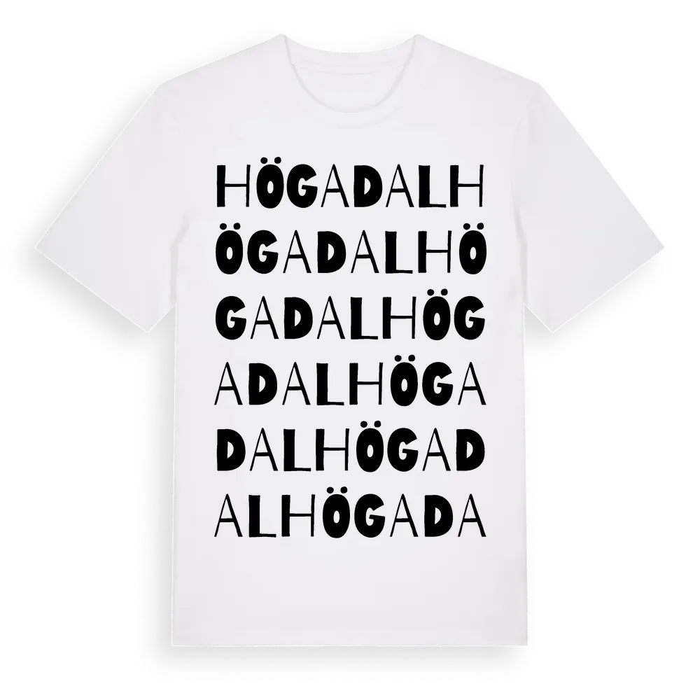 Högadal ordlek t-shirt är inspirerad av stadsdelen Högadal i Blekinge län, Sverige. Tröjan är designad för dig som har en speciell koppling till platsen – oavsett om du bor här, har rötterna här eller bara älskar Högadal.