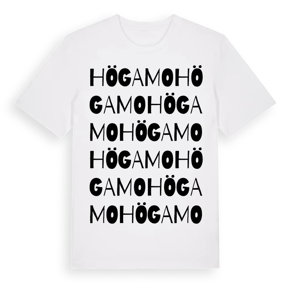 Högamo ordlek t-shirt är inspirerad av byn Högamo i Blekinge län, Sverige. Tröjan är designad för dig som har en speciell koppling till platsen – oavsett om du bor här, har rötterna här eller bara älskar Högamo.