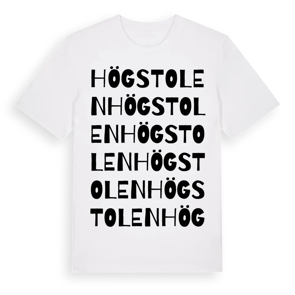Högstolen ordlek t-shirt är inspirerad av Högstolen i Blekinge län, Sverige. Tröjan är designad för dig som har en speciell koppling till platsen – oavsett om du bor här, har rötterna här eller bara älskar Högstolen.