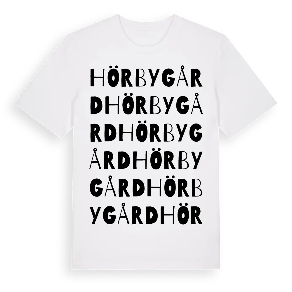 Hörby Gård ordlek t-shirt är inspirerad av byn Hörby Gård i Blekinge län, Sverige. Tröjan är designad för dig som har en speciell koppling till platsen – oavsett om du bor här, har rötterna här eller bara älskar Hörby Gård.