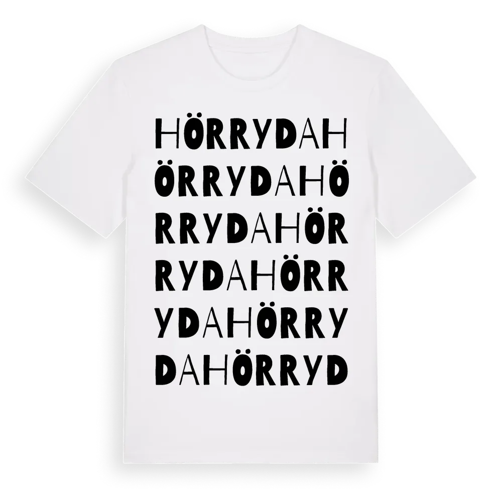 Hörryda ordlek t-shirt är inspirerad av byn Hörryda i Blekinge län, Sverige. Tröjan är designad för dig som har en speciell koppling till platsen – oavsett om du bor här, har rötterna här eller bara älskar Hörryda.