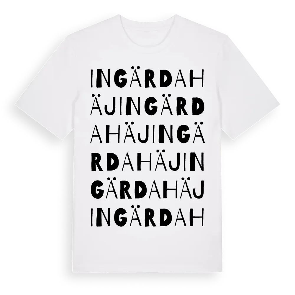 Ingärdahäj ordlek t-shirt är inspirerad av byn Ingärdahäj i Blekinge län, Sverige. Tröjan är designad för dig som har en speciell koppling till platsen – oavsett om du bor här, har rötterna här eller bara älskar Ingärdahäj.