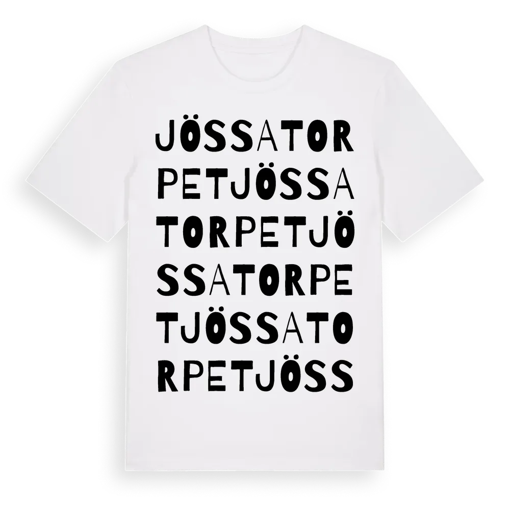 Jössatorpet ordlek t-shirt är inspirerad av Jössatorpet i Blekinge län, Sverige. Tröjan är designad för dig som har en speciell koppling till platsen – oavsett om du bor här, har rötterna här eller bara älskar Jössatorpet.