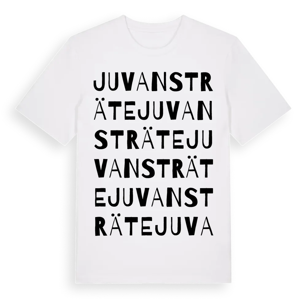 Juvansträte ordlek t-shirt är inspirerad av Juvansträte i Blekinge län, Sverige. Tröjan är designad för dig som har en speciell koppling till platsen – oavsett om du bor här, har rötterna här eller bara älskar Juvansträte.