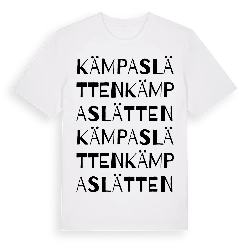 Kämpaslätten ordlek t-shirt är inspirerad av stadsdelen Kämpaslätten i Blekinge län, Sverige. Tröjan är designad för dig som har en speciell koppling till platsen – oavsett om du bor här, har rötterna här eller bara älskar Kämpaslätten.