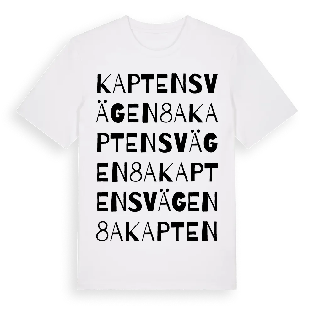 Kaptensvägen 8A ordlek t-shirt är inspirerad av Kaptensvägen 8A i Blekinge län, Sverige. Tröjan är designad för dig som har en speciell koppling till platsen – oavsett om du bor här, har rötterna här eller bara älskar Kaptensvägen 8A.