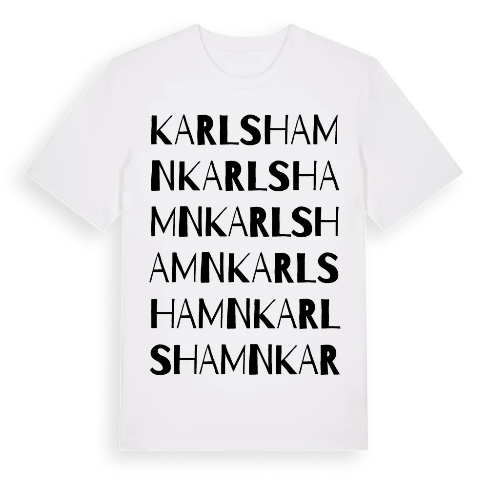 Karlshamn ordlek t-shirt är inspirerad av staden Karlshamn i Blekinge län, Sverige. Tröjan är designad för dig som har en speciell koppling till platsen – oavsett om du bor här, har rötterna här eller bara älskar Karlshamn.