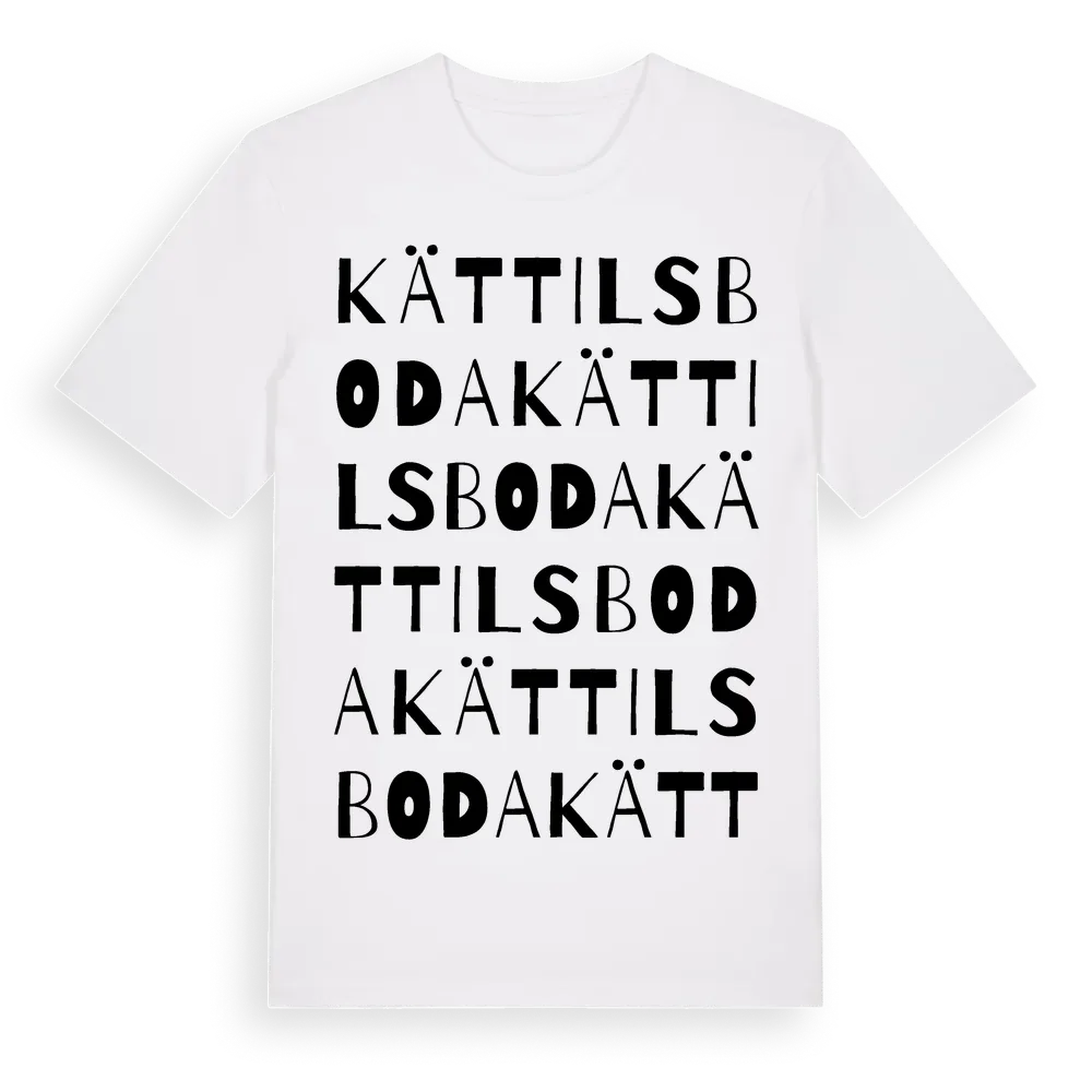 Kättilsboda ordlek t-shirt är inspirerad av byn Kättilsboda i Blekinge län, Sverige. Tröjan är designad för dig som har en speciell koppling till platsen – oavsett om du bor här, har rötterna här eller bara älskar Kättilsboda.