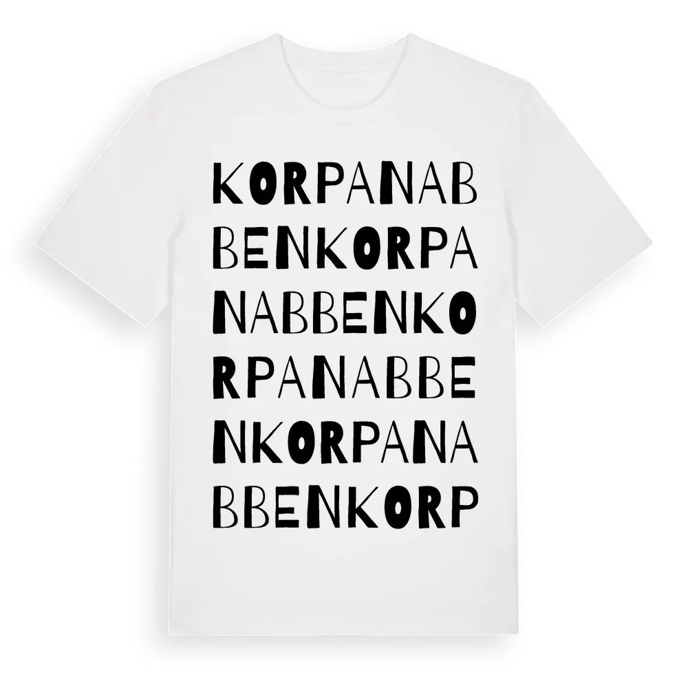 Korpanabben ordlek t-shirt är inspirerad av Korpanabben i Blekinge län, Sverige. Tröjan är designad för dig som har en speciell koppling till platsen – oavsett om du bor här, har rötterna här eller bara älskar Korpanabben.