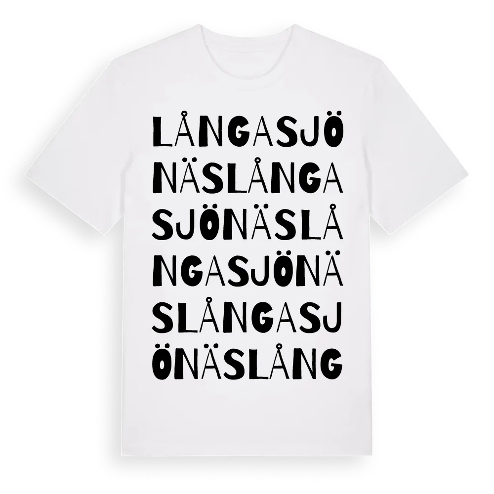 Långasjönäs ordlek t-shirt är inspirerad av byn Långasjönäs i Blekinge län, Sverige. Tröjan är designad för dig som har en speciell koppling till platsen – oavsett om du bor här, har rötterna här eller bara älskar Långasjönäs.