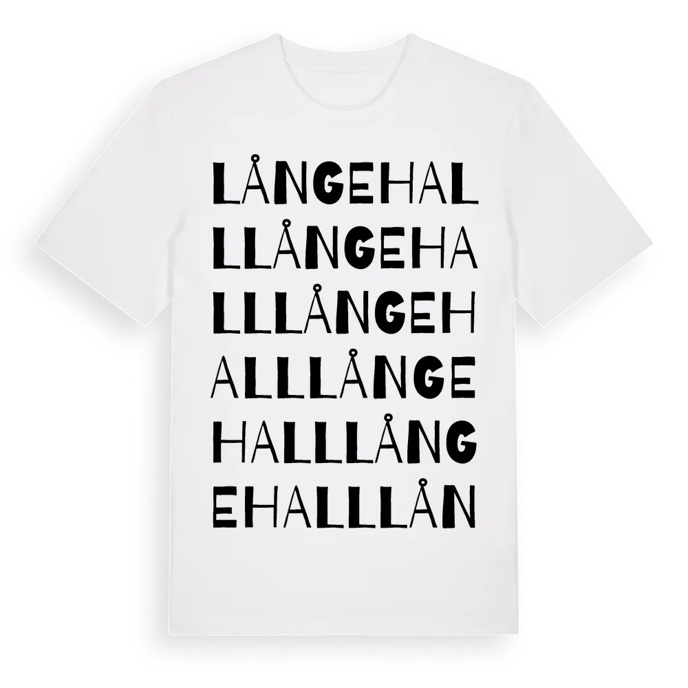 Långehall ordlek t-shirt är inspirerad av byn Långehall i Blekinge län, Sverige. Tröjan är designad för dig som har en speciell koppling till platsen – oavsett om du bor här, har rötterna här eller bara älskar Långehall.