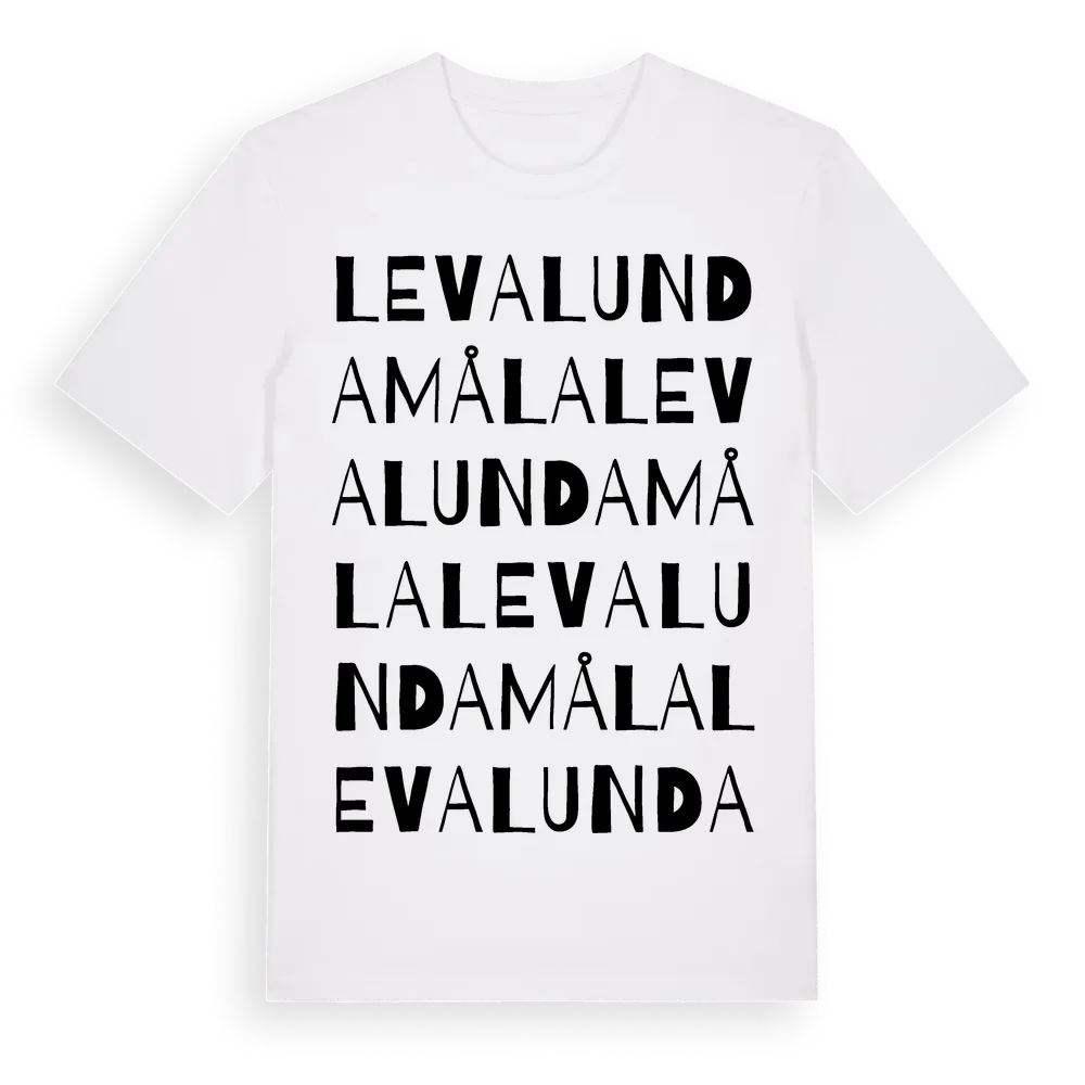 Levalundamåla ordlek t-shirt är inspirerad av Levalundamåla i Blekinge län, Sverige. Tröjan är designad för dig som har en speciell koppling till platsen – oavsett om du bor här, har rötterna här eller bara älskar Levalundamåla.
