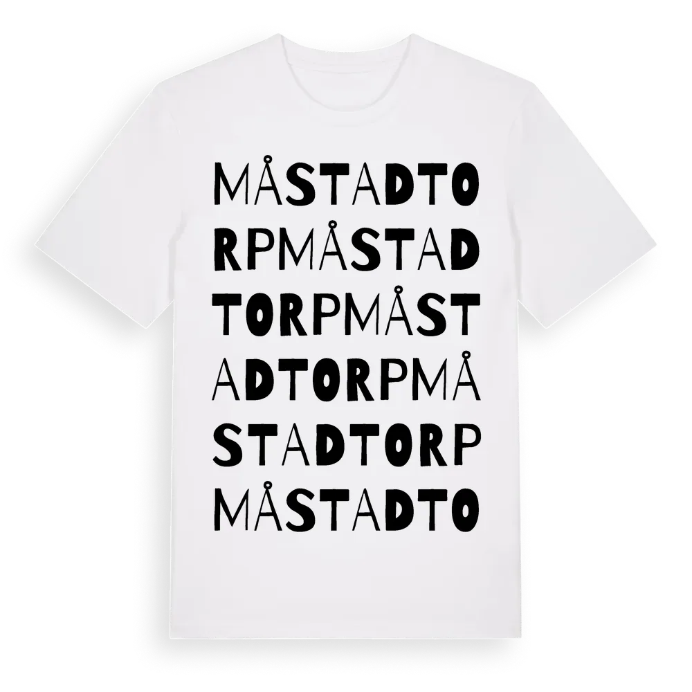 Måstadtorp ordlek t-shirt är inspirerad av Måstadtorp i Blekinge län, Sverige. Tröjan är designad för dig som har en speciell koppling till platsen – oavsett om du bor här, har rötterna här eller bara älskar Måstadtorp.