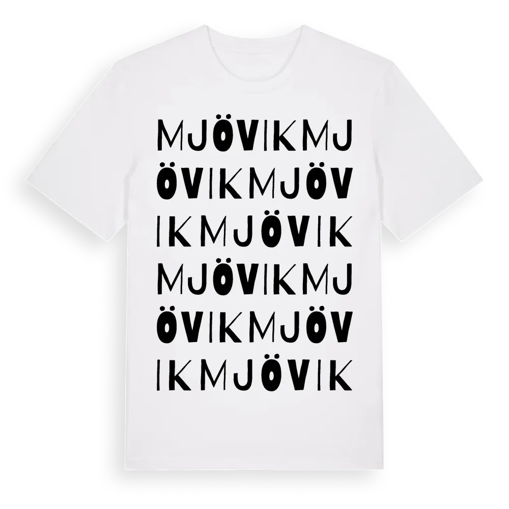 Mjövik ordlek t-shirt är inspirerad av stadsdelen Mjövik i Blekinge län, Sverige. Tröjan är designad för dig som har en speciell koppling till platsen – oavsett om du bor här, har rötterna här eller bara älskar Mjövik.