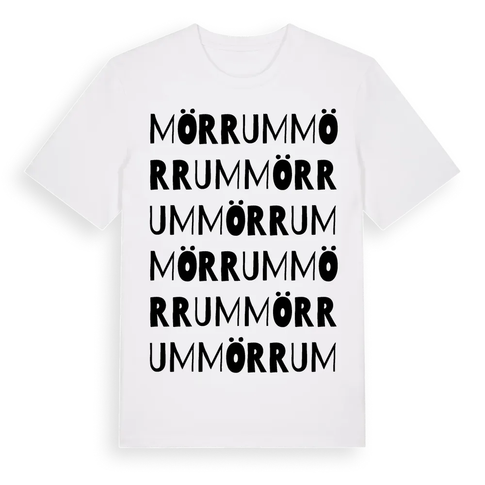 En ordlek byggd på Mörrums namn. Subtilt och klurig – ett motiv som bara de som verkligen känner platsen fullt ut förstår. Premium bomull, unisex – från staden Mörrum i Blekinge län.