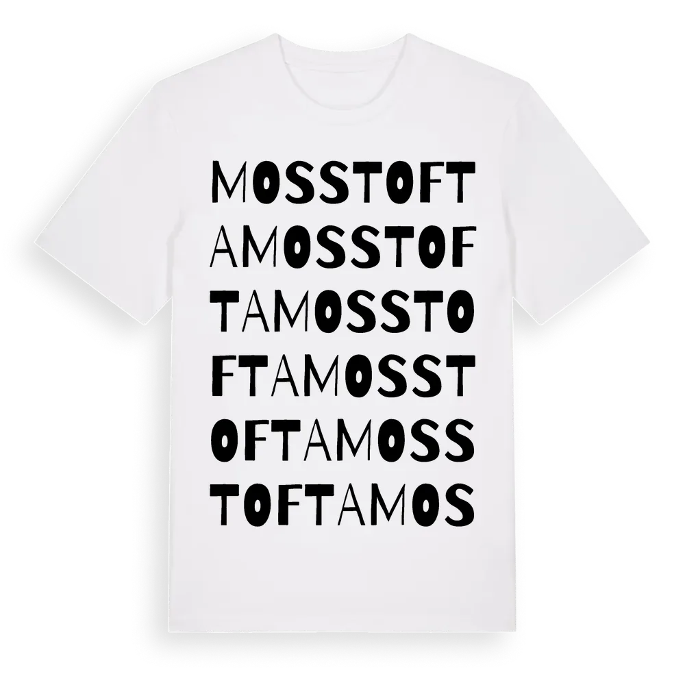 Mosstofta ordlek t-shirt är inspirerad av Mosstofta i Blekinge län, Sverige. Tröjan är designad för dig som har en speciell koppling till platsen – oavsett om du bor här, har rötterna här eller bara älskar Mosstofta.