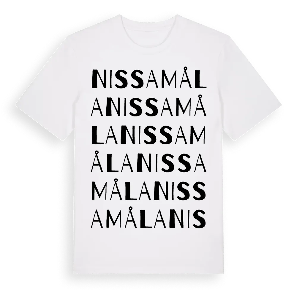 Nissamåla ordlek t-shirt är inspirerad av Nissamåla i Blekinge län, Sverige. Tröjan är designad för dig som har en speciell koppling till platsen – oavsett om du bor här, har rötterna här eller bara älskar Nissamåla.
