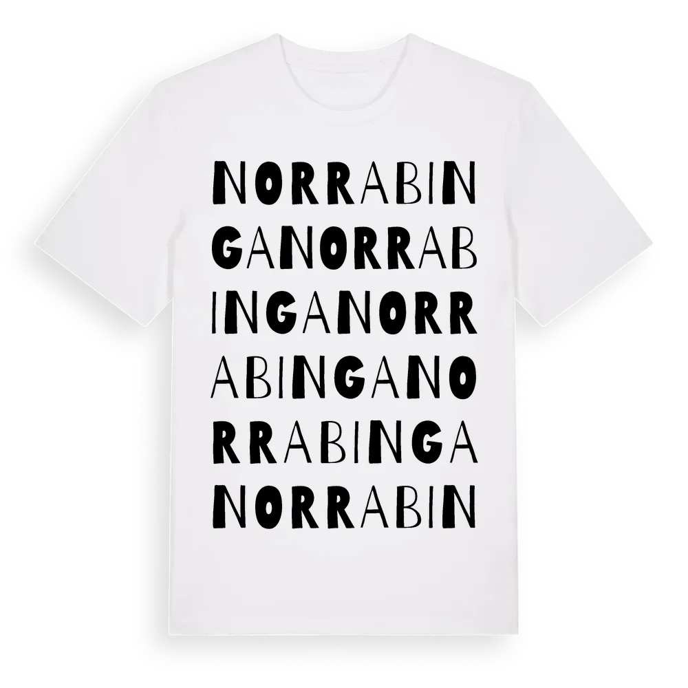 Norra Binga ordlek t-shirt är inspirerad av byn Norra Binga i Blekinge län, Sverige. Tröjan är designad för dig som har en speciell koppling till platsen – oavsett om du bor här, har rötterna här eller bara älskar Norra Binga.