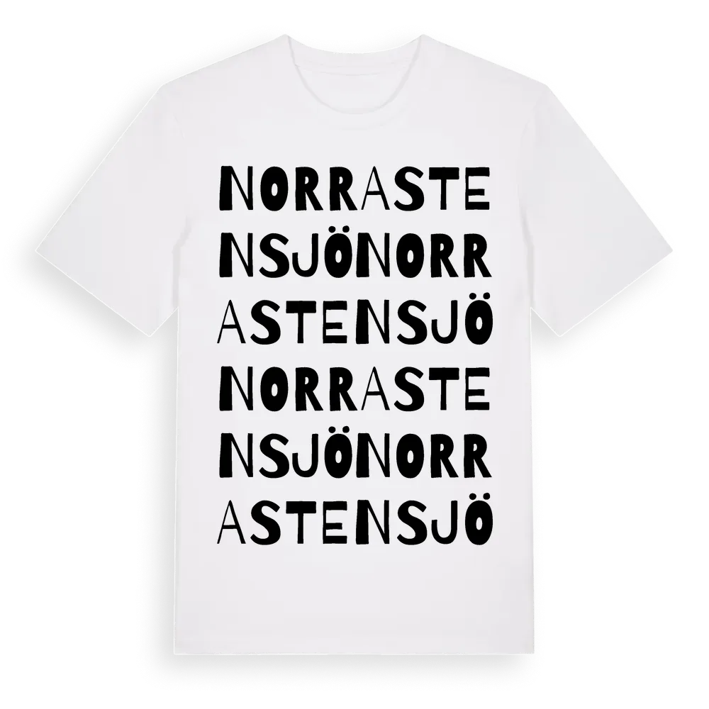 Norra Stensjö ordlek t-shirt är inspirerad av byn Norra Stensjö i Blekinge län, Sverige. Tröjan är designad för dig som har en speciell koppling till platsen – oavsett om du bor här, har rötterna här eller bara älskar Norra Stensjö.