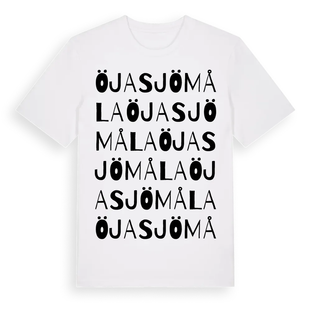 Öjasjömåla ordlek t-shirt är inspirerad av byn Öjasjömåla i Blekinge län, Sverige. Tröjan är designad för dig som har en speciell koppling till platsen – oavsett om du bor här, har rötterna här eller bara älskar Öjasjömåla.