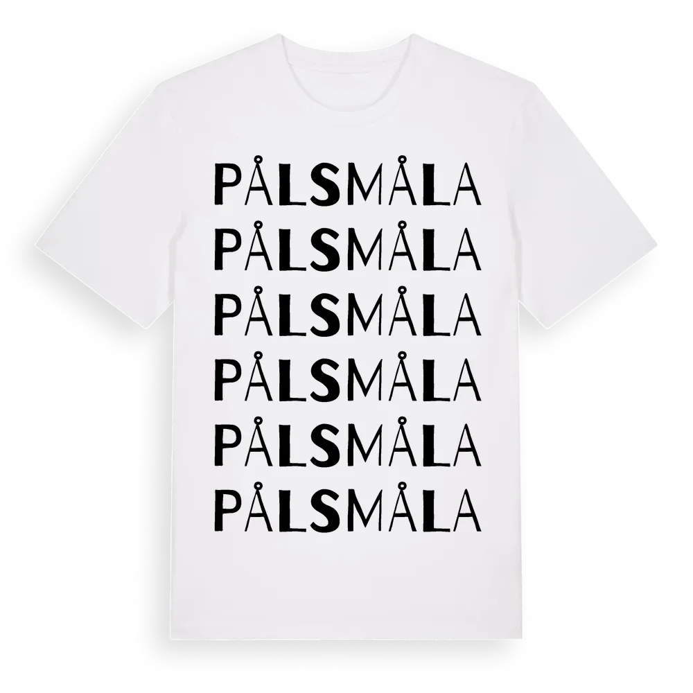 Pålsmåla ordlek t-shirt är inspirerad av Pålsmåla i Blekinge län, Sverige. Tröjan är designad för dig som har en speciell koppling till platsen – oavsett om du bor här, har rötterna här eller bara älskar Pålsmåla.