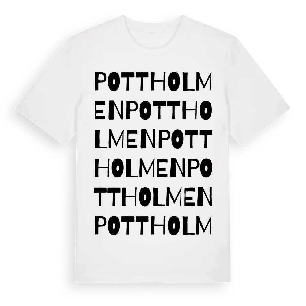 Pottholmen ordlek t-shirt är inspirerad av stadsdelen Pottholmen i Blekinge län, Sverige. Tröjan är designad för dig som har en speciell koppling till platsen – oavsett om du bor här, har rötterna här eller bara älskar Pottholmen.
