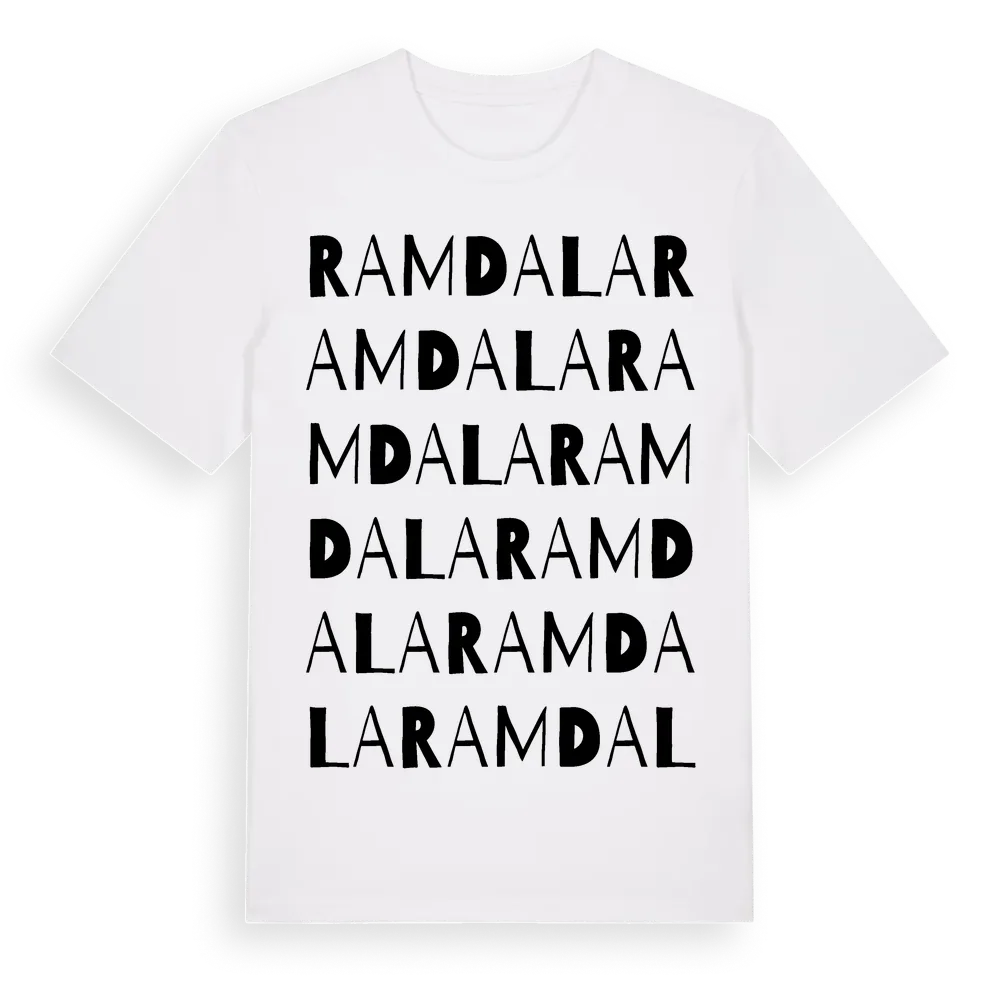 Ramdala ordlek t-shirt är inspirerad av byn Ramdala i Blekinge län, Sverige. Tröjan är designad för dig som har en speciell koppling till platsen – oavsett om du bor här, har rötterna här eller bara älskar Ramdala.